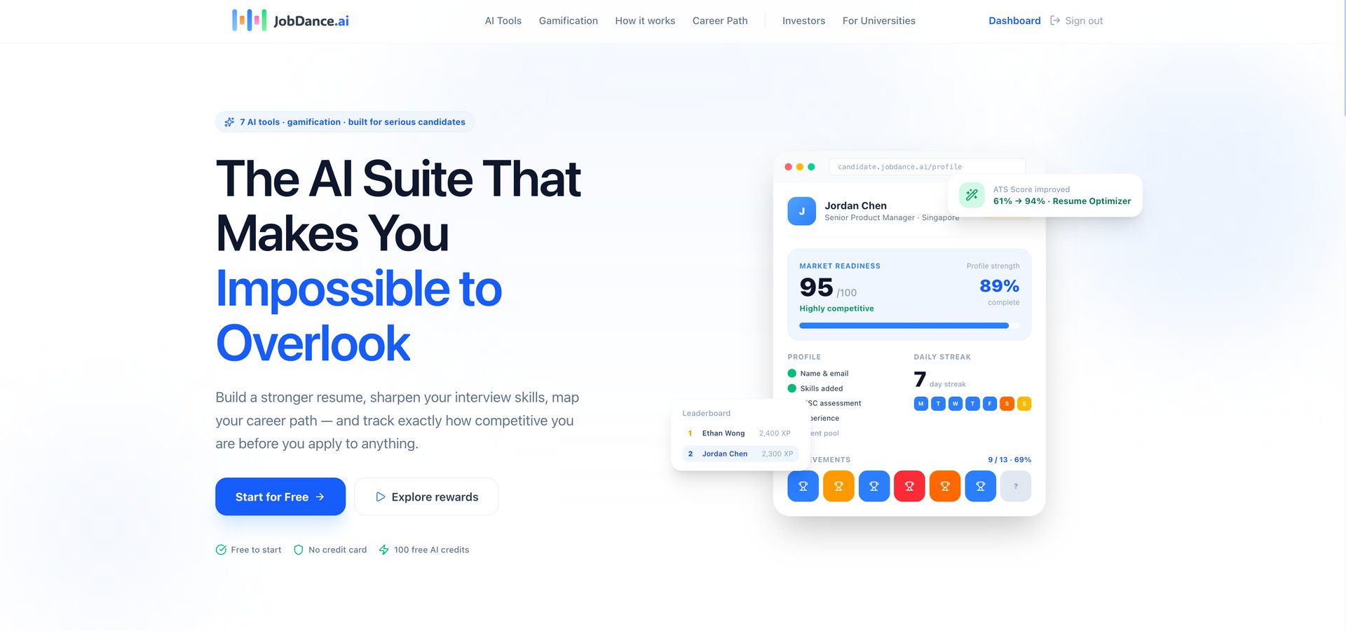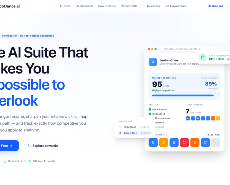 Jobdance.ai is an all-in-one, AI-powered platform designed to help candidates map their career paths, write perfect cover letters, ace interviews, and get discovered by top companies. By incorporating gamification into the platform, we transform the traditionally stressful job-hunting experience into an engaging, interactive, and rewarding journey for users.