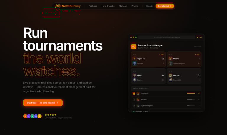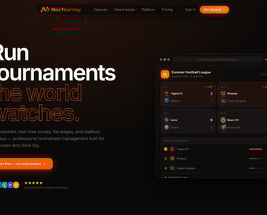 NexTourney is a professional tournament management platform designed to help organizers run sports and e-sports events with real-time updates. It provides an all-in-one "command center" featuring live brackets, automated scoring, smart scheduling and so on.